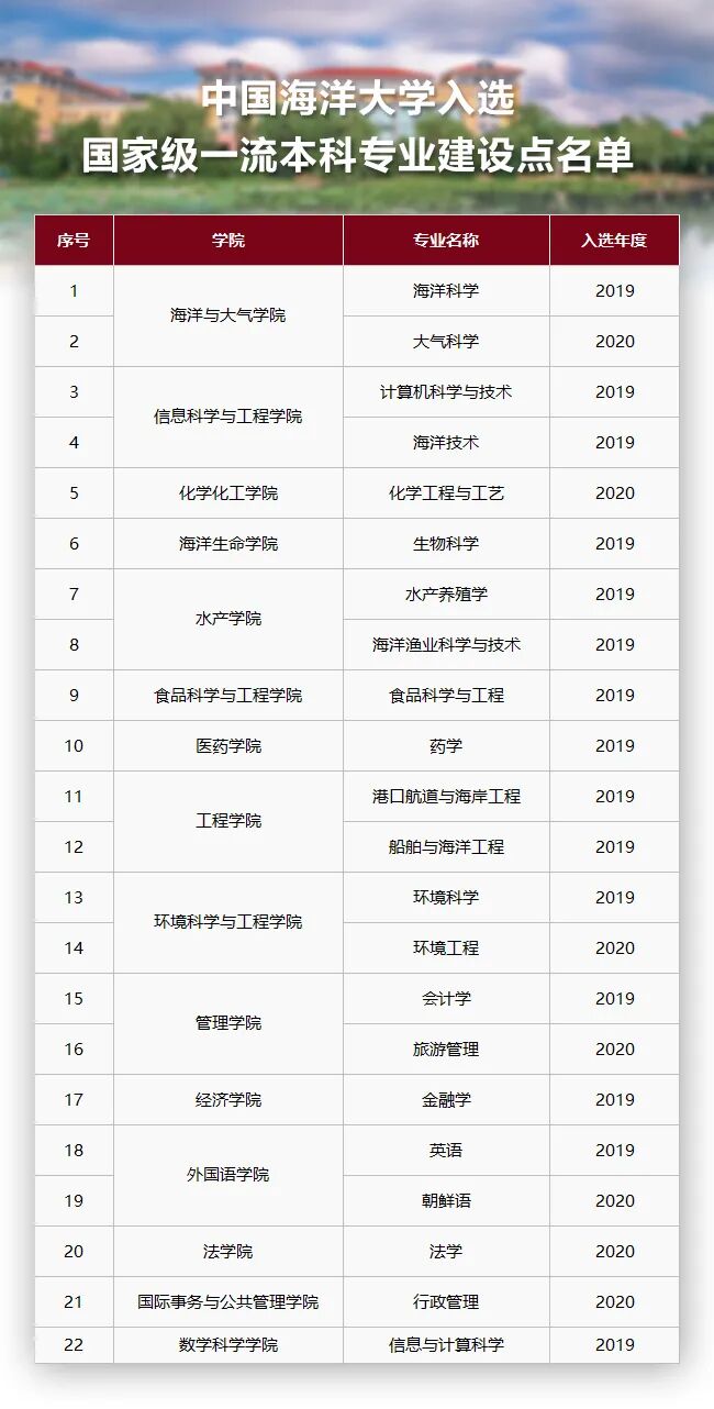 至此,中国海洋大学共有22个专业入选国家级一流本科专业建设点,15个专业入选省级一流本科专业建设点。