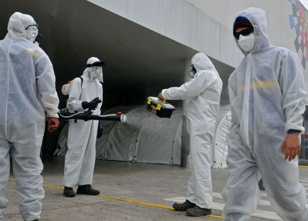 5月6日,在厄瓜多尔瓜亚基尔一家收治新冠患者的医院,工作人员进行消杀工作。新华社/法新