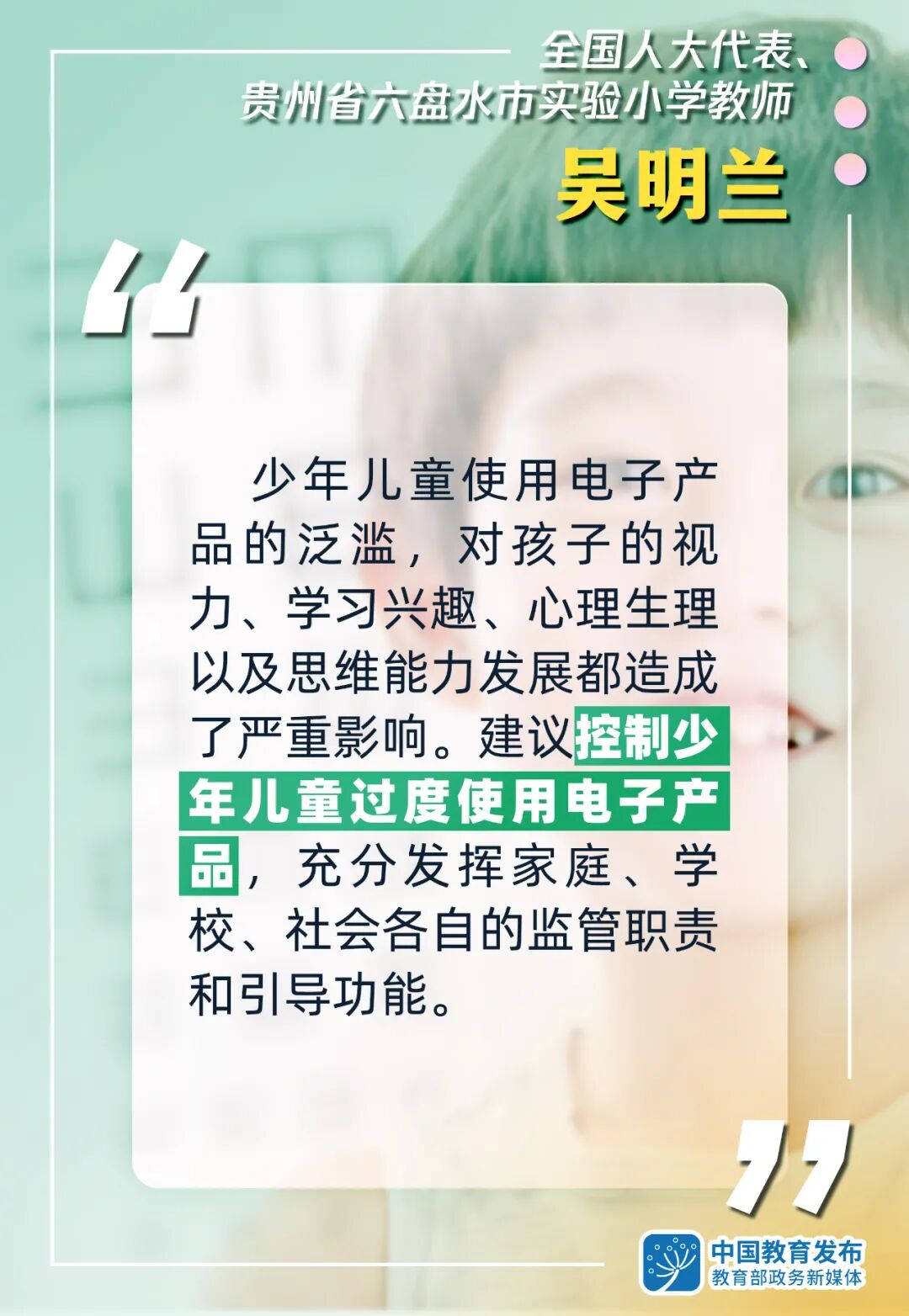 别让孩子变成“小眼镜”!代表委员为青少年近视防控支招 2021-03-11 10:25 青岛日报社/观海新闻 0 两会期间,青少年近视防控成为代表委员关心的话题。怎样防止孩子变成“小眼镜”?一起听听代表委员怎么说—— (中国教育发布) 责任编辑:李婧菲