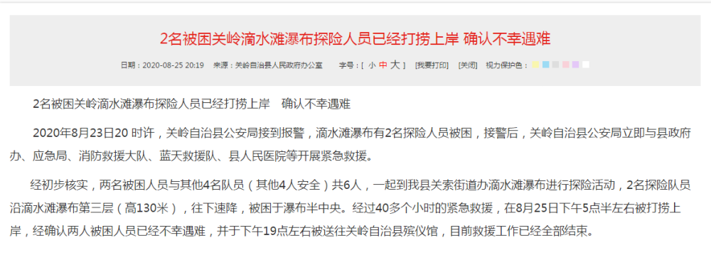 经初步核实,两名被困人员与其他4名队员(其他4人安全)共6人,一起到我县关索街道办滴水滩瀑布进行探险活动,2名探险队员沿滴水滩瀑布第三层(高130米),往下速降,被困于瀑布半中央。经过40多个小时的紧急救援,在8月25日下午5点半左右被打捞上岸,经确认两人被困人员已经不幸遇难,并于下午19点左右被送往关岭自治县殡仪馆,目前救援工作已经全部结束。