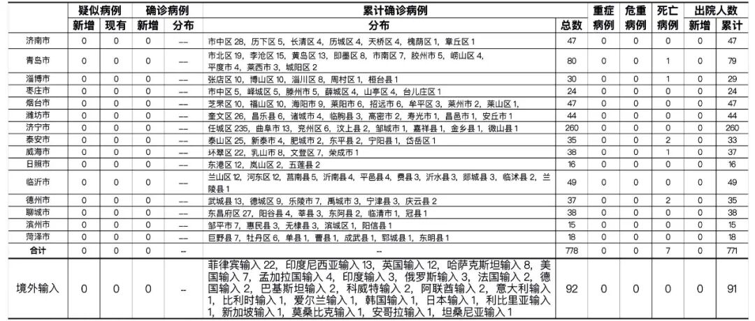 山东无新增本地疑似病例、确诊病例。累计报告确诊病例778例,死亡7例,治愈出院771例。