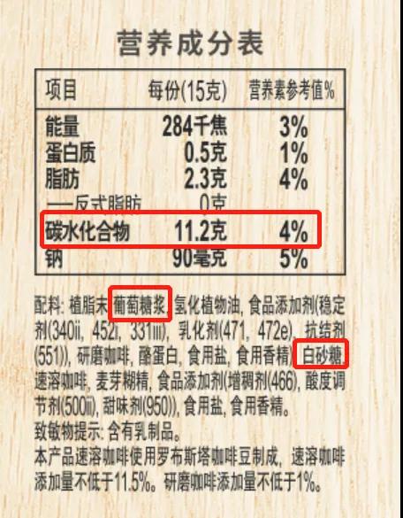 常见的添加糖包括:白砂糖、红糖、冰糖、果葡糖浆、葡萄糖浆、玉米糖浆、麦芽糖浆、蜂蜜、果糖等。比如下图这款速溶咖啡其中就添加了葡萄糖浆和白砂糖。通过营养成分表可以得知,碳水化合物含量为11.2g/15g(一袋),也就是说,喝下去一袋这样的速溶咖啡,摄入的糖约为11.2g。