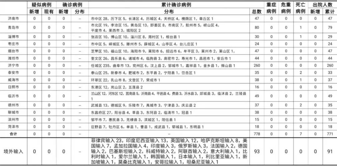 山东无新增本地疑似病例、确诊病例。累计报告确诊病例778例,死亡7例,治愈出院771例。