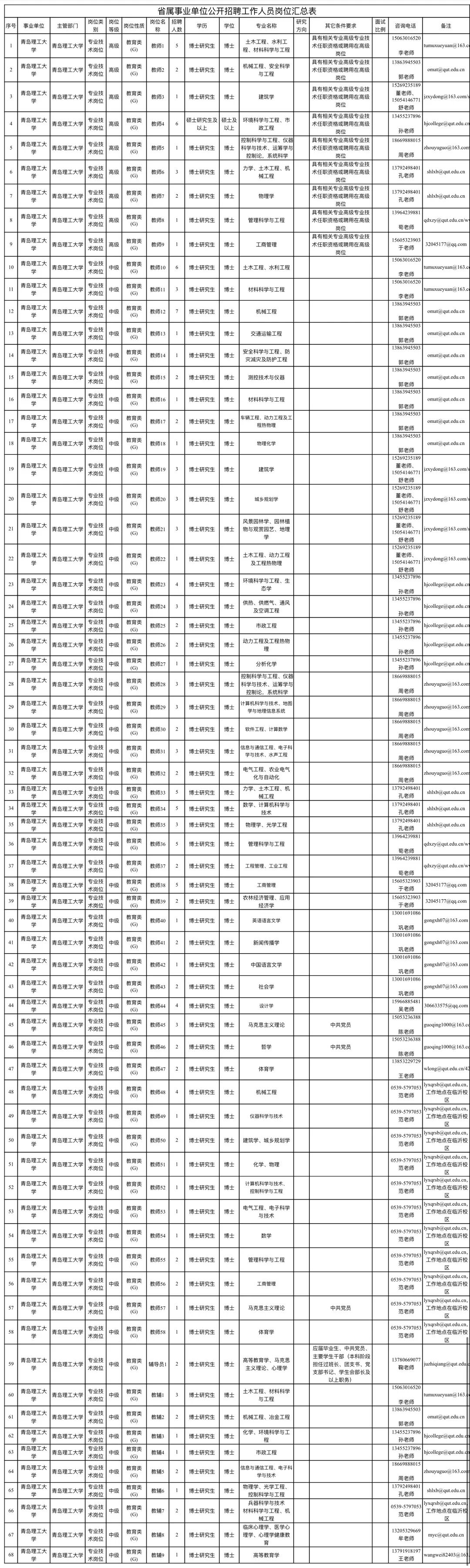 根据省委组织部、省人力资源和社会保障厅《关于做好2021年事业单位公开招聘工作人员有关问题的通知》(鲁人社发〔2020〕155号)、《关于印发2021年度省属事业单位公开招聘工作实施方案的通知》(鲁人社发〔2021〕7号)要求,结合学校实际工作需要,青岛理工大学拟面向社会公开招聘专业技术岗位工作人员159人,其中,高级专业技术人员22人,中级专业技术人员137人。具体岗位及条件要求详见《省属事业单位公开招聘工作人员岗位汇总表》(附件1)。