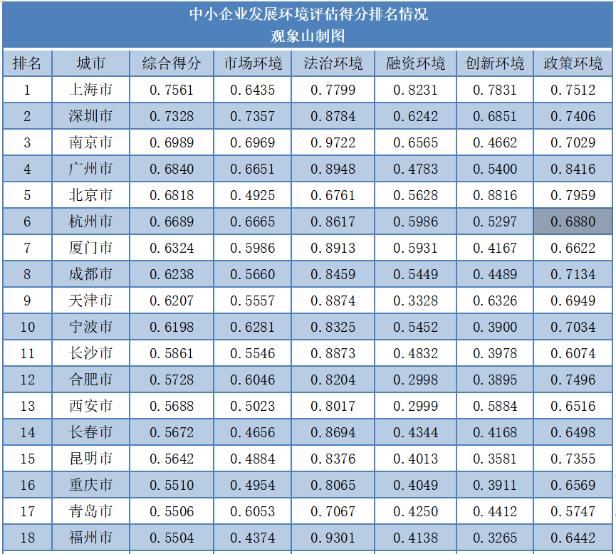 评估显示,在中小企业发展环境综合得分上,上海、深圳、南京、广州、北京、杭州、厦门、成都、天津、宁波位居前十。