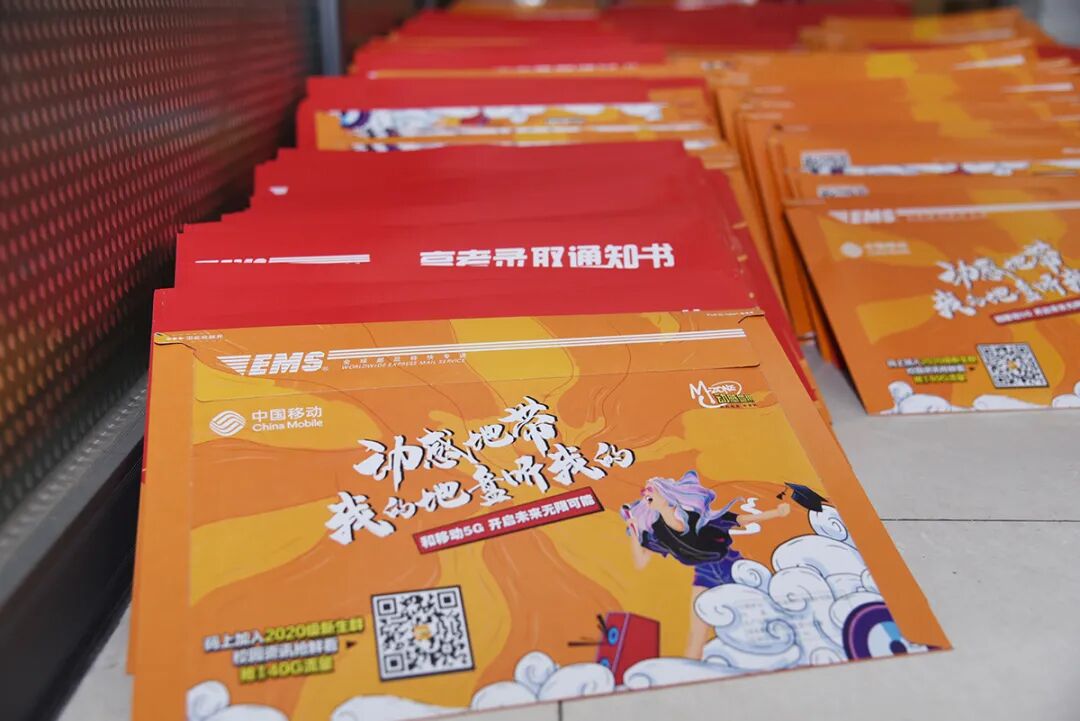 录取通知书的分装现场,打印、分类、袋装、寄送,工作人员们正一丝不苟地整理着……