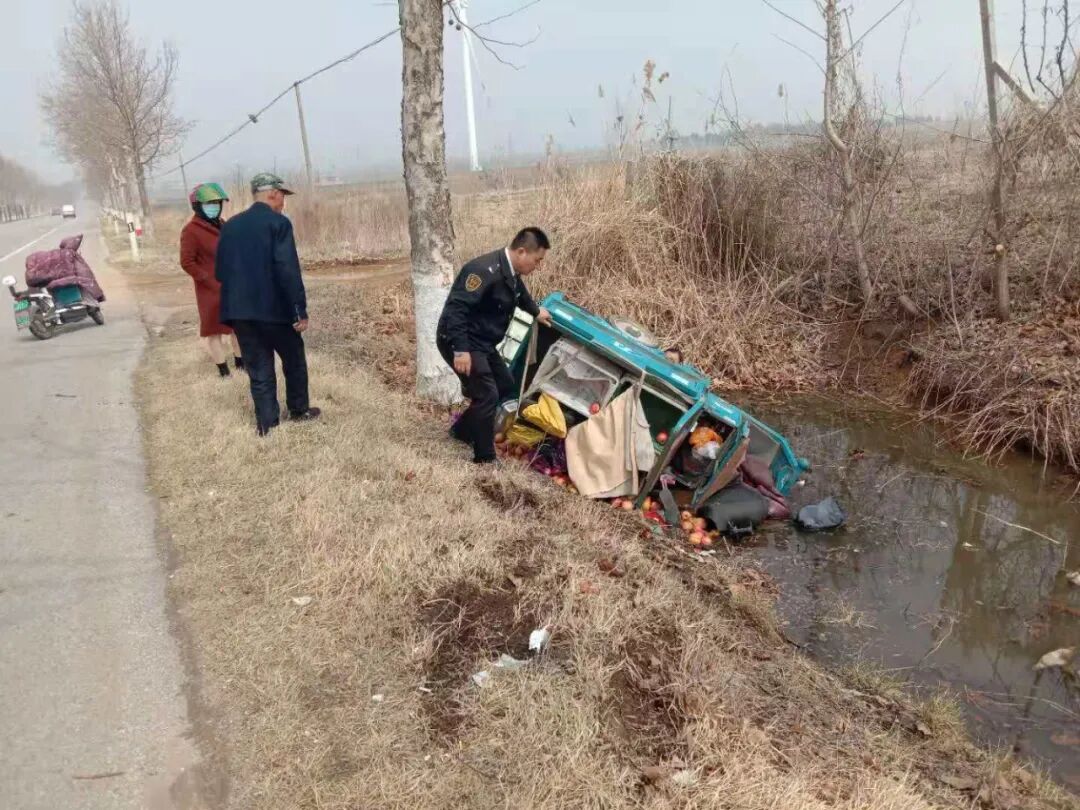 3月28日中午11点20分左右,莱西市河头店镇岚子村70岁村民邹清良用电动三轮车拉着自己家的苹果赶完集回家,大淳于村村民鹿占光也开着电动三轮车外出办事,两人在河头店镇瑞岭村附近路上相遇,前后运行,不经意间两车追尾,连人带车扎进路沟积水中。两人被三轮车压住,邹清良不省人事、鹿占光不能动弹,生命危在旦夕。