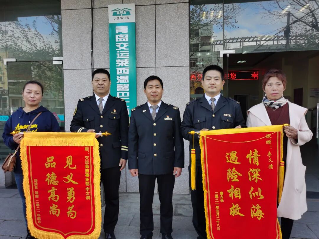 4月12日下午,青岛莱西市河头店镇岚子村、大淳于村两位村民一起将两面分别刻有“见义勇为,品德高尚”“情深似海,遇险相救”的锦旗,送到青岛城运控股交运集团莱西事业部温馨巴士办公室。交运莱西事业部副总经理、温馨巴士经理李波永与被感谢的温馨巴士城乡公交801路“莱西--唐家庄”线路驾驶员李文清当面接受锦旗。至此,最美公交驾驶员李文清半个月前挺身救人的故事被传为美谈。