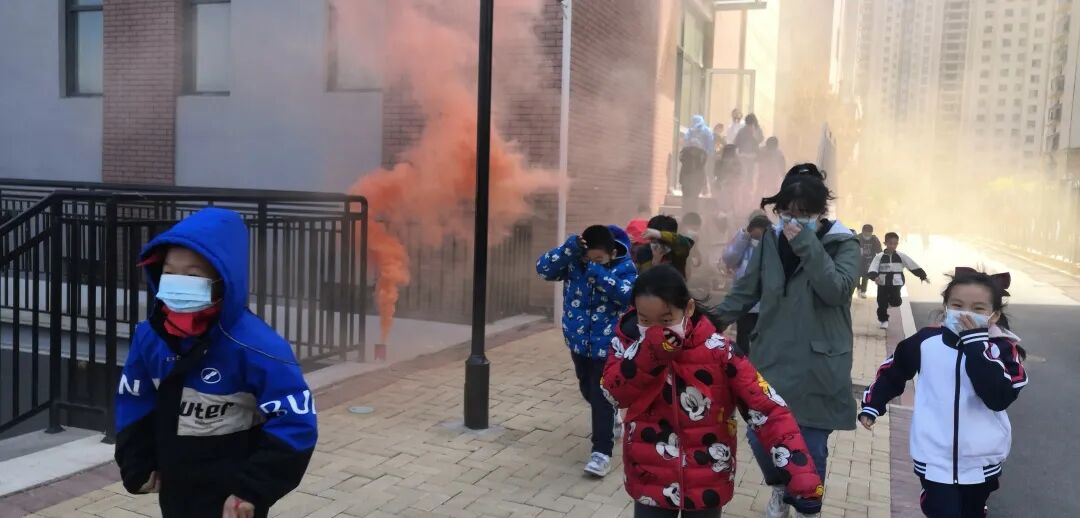 本次演练模拟的是同学们在上课期间教学楼内的实验室突然发生火情,在教师的疏导下迅速撤离火场的情景。随着消防警报的响起,全体师生迅速进入状态,导护教师在指定位置协助同学们快速、有序撤离。班主任带领同学们弯腰低头,用湿毛巾捂住口鼻,沿指定路线迅速撤离至操场安全地带。
