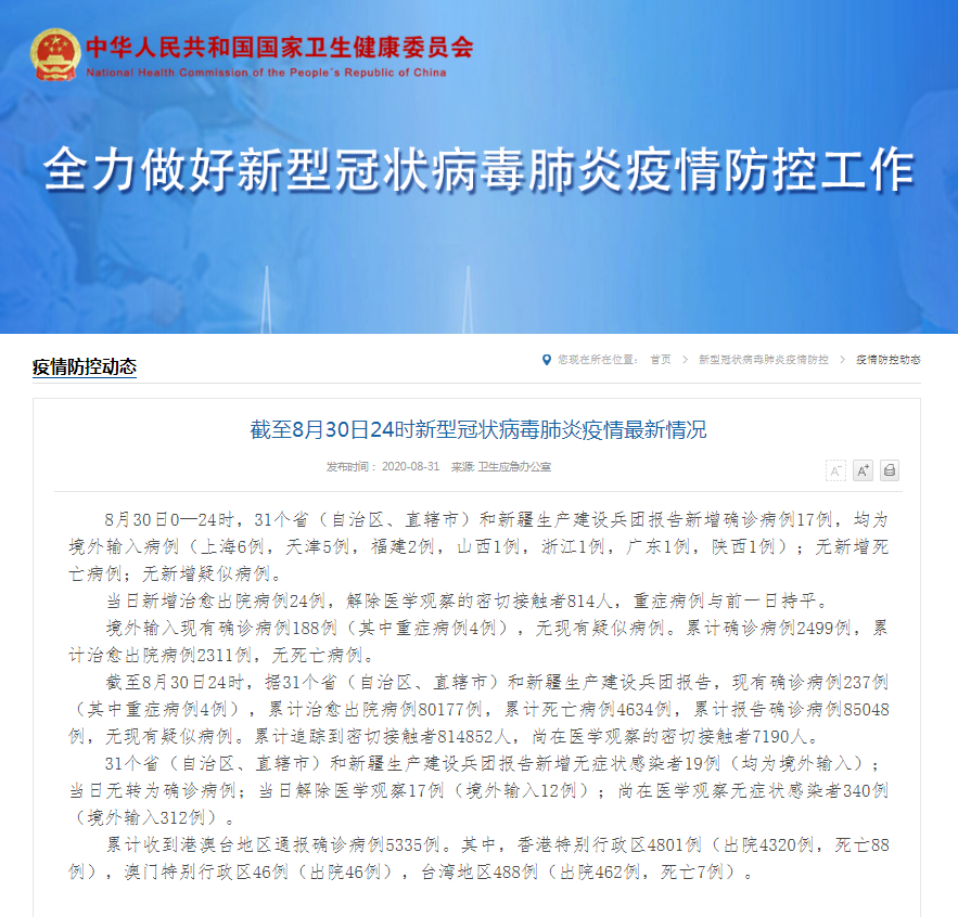 截至8月30日24时,据31个省(自治区、直辖市)和新疆生产建设兵团报告,现有确诊病例237例(其中重症病例4例),累计治愈出院病例80177例,累计死亡病例4634例,累计报告确诊病例85048例,无现有疑似病例。累计追踪到密切接触者814852人,尚在医学观察的密切接触者7190人。