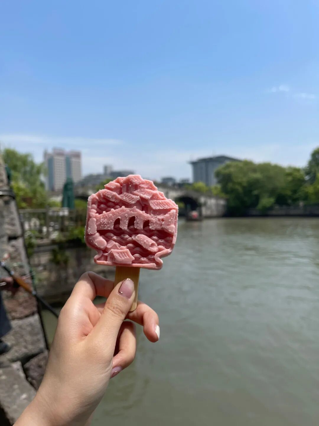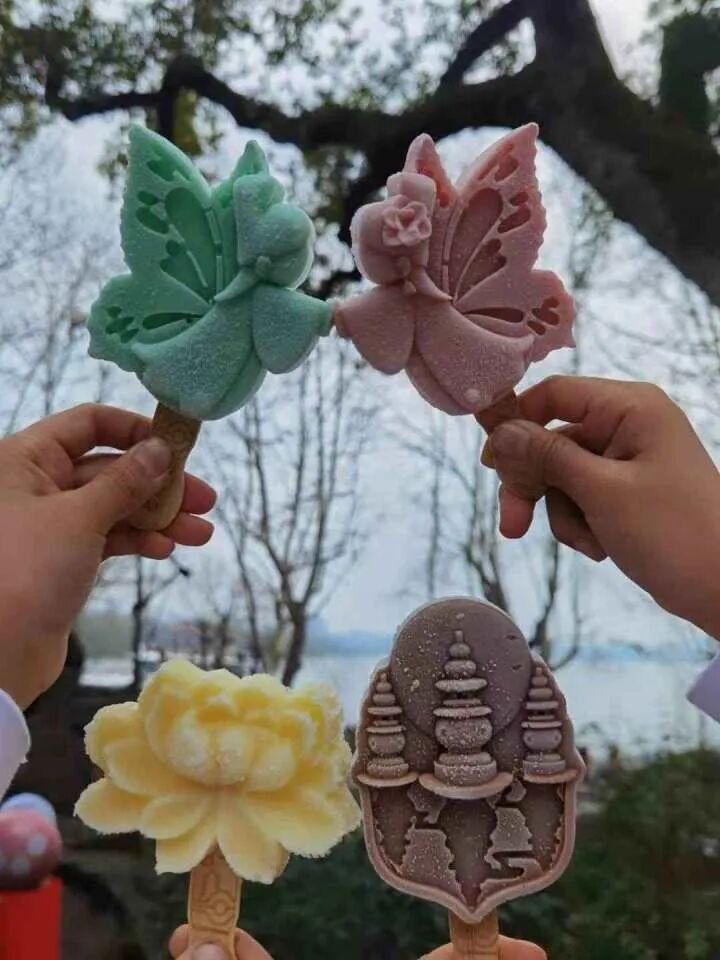 西湖也没掉队,三潭映月、许仙白娘子、莲花,自去年夏天推出以来,就“火”出了圈。除了西湖文创棒冰之外,今年4月份,还推出了新的运河主题文创棒冰。20块一只,在拱宸桥附近好几个小店都有在售卖。