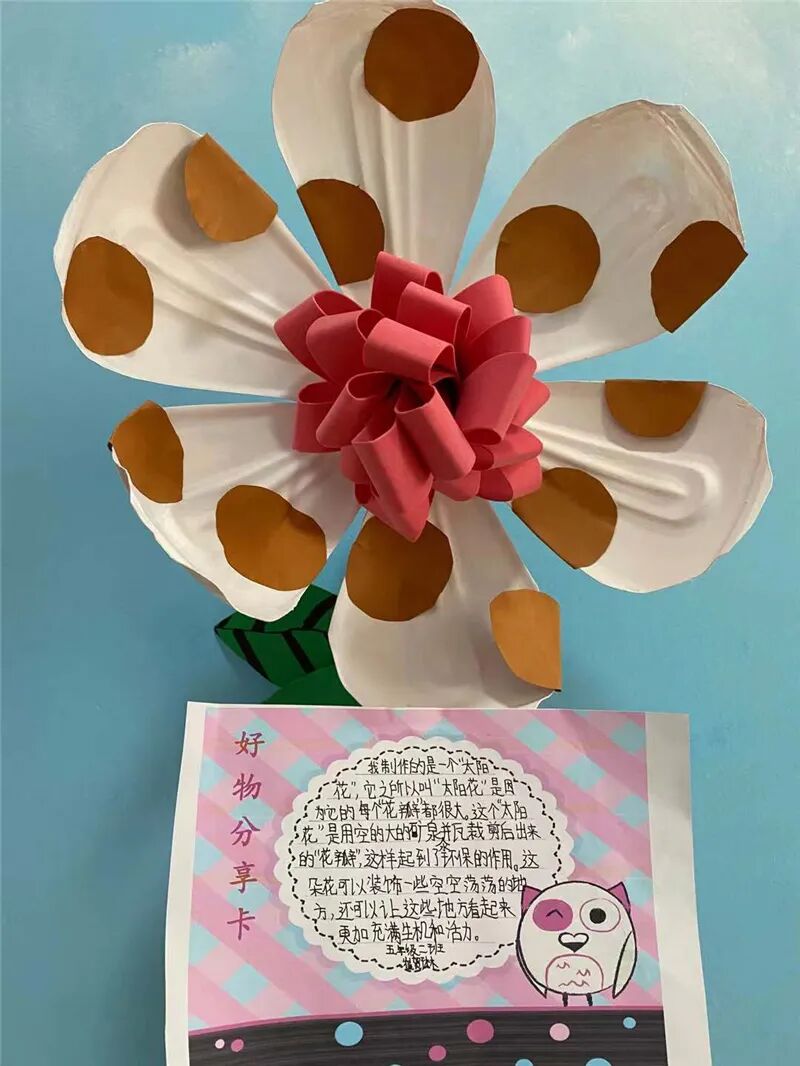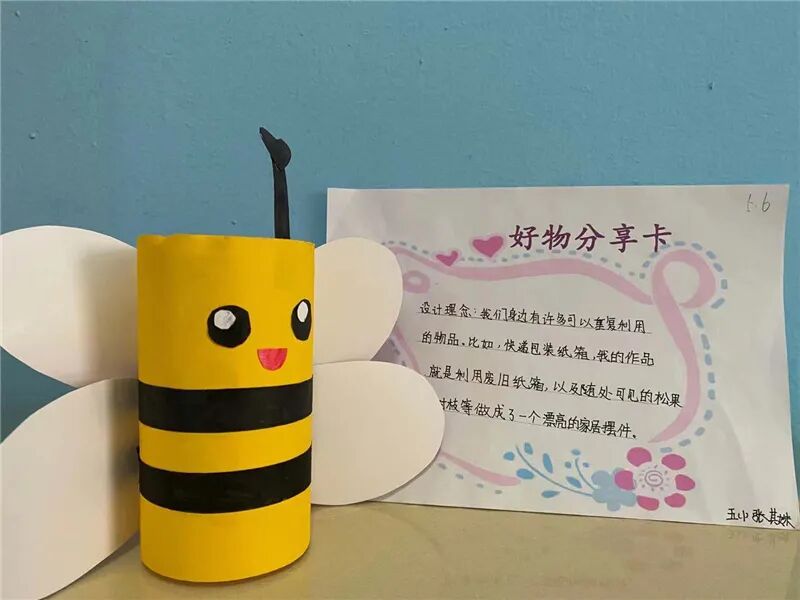 一双灵巧手,花儿朵朵开,让我们一起走进万紫千红的花花世界:那一朵向日葵,新染鹅黄色未乾;这一枝用旧酒瓶和纸壳完成的玉兰插花,霓裳片片晚妆新,束素亭亭玉殿春,争奇斗艳,令人不禁感叹:长恨春归无觅处,不知转入此中来。旧木棍、废电池、旧纸壳、塑料袋,从“垃圾”到“作品”的过程中,孩子们能不断创新、大胆尝试,让废旧物品“重获新生”,不仅可以丰富疫情期间孩子们的假期生活,也能让孩子们开动脑筋,锻炼动手能力,在生活中发现美、欣赏美、创造美,在心中种下一颗环保的种子。