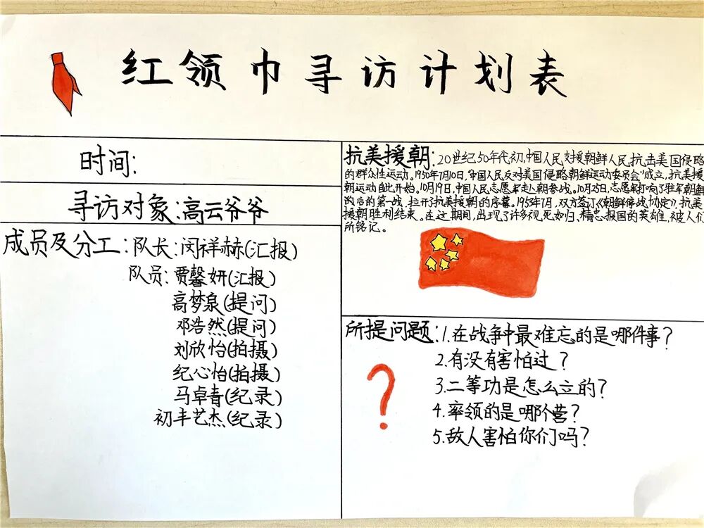 在寻访之前,在中队辅导员的引导下,队员们通过上网查资料、咨询家长等方式了解了抗美援朝的历史,梳理、记录重要信息,从最简单的表格小调查、数字比较做起。在这个过程中,他们被自己搜集到的一组组难以想象的数据,一个个令人动容的史实故事,所感动所震撼。用稚嫩的笔记录下自己的感受列出红领巾寻访的问题清单,自主制订寻访计划,安排分工。