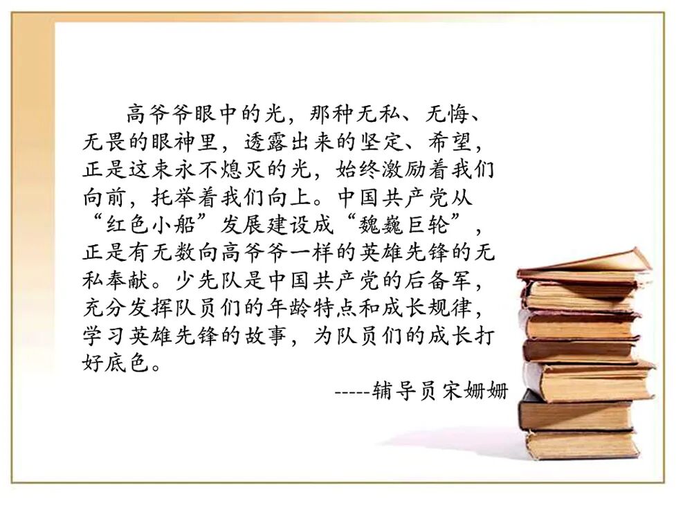 通过此次寻访活动,不仅让队员们知道了今天的生活是怎样得来的,更深入理解了中国共产党人的崇高精神和使命担当。在他们的讲述、绘画和研学过程中,他们正在向榜样靠拢。队员们纷纷表示,将把高爷爷不畏艰难、舍己为人的精神和全心全意为人民服务的初心使命,传递给更多的同学,从小学先锋,长大做先锋,为实现我们下一个百年目标而努力奋斗!(通讯员 李越)