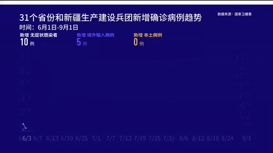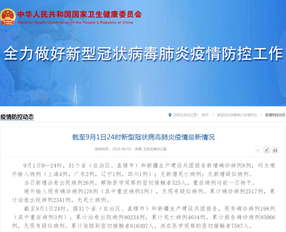 9月1日0—24时,31个省(自治区、直辖市)和新疆生产建设兵团报告新增确诊病例8例,均为境外输入病例(上海4例,广东2例,辽宁1例,四川1例);无新增死亡病例;无新增疑似病例。