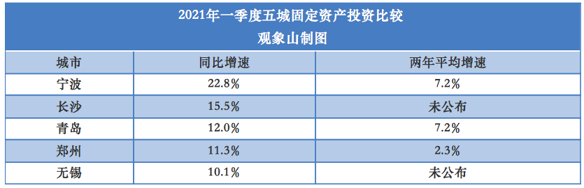 五城的竞争格局发生较大变化:2020年一季度,排名为长沙、青岛、郑州、无锡、宁波;2021年一季度,排名变为宁波、长沙、青岛、无锡、郑州。除了无锡位次不变外,其他四城排名都发生了变化。