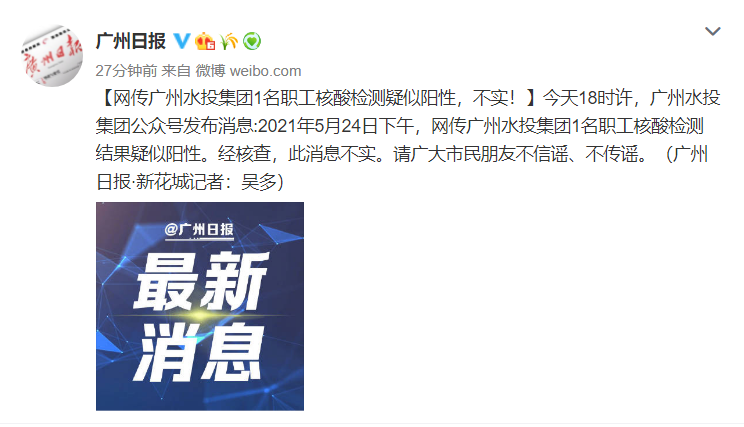 网传广州水投集团1名职工核酸检测疑似阳性,不实! 2021-05-24 20:09 广州日报微博 0 今天18时许,广州水投集团公众号发布消息:2021年5月24日下午,网传广州水投集团1名职工核酸检测结果疑似阳性。经核查,此消息不实。请广大市民朋友不信谣、不传谣。(记者:吴多) 责任编辑:程雪涵