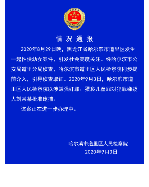 近日,一则“哈尔滨女童失踪一晚,次日回家多处是伤”的消息引发关注。9月1日,黑龙江省哈尔滨市公安局道里分局发布警情通报:8月29日晚接报警称,一名5岁女童被人领走。警方于8月30日将涉嫌强奸犯罪的犯罪嫌疑人刘某某抓获,并依法对其刑事拘留。