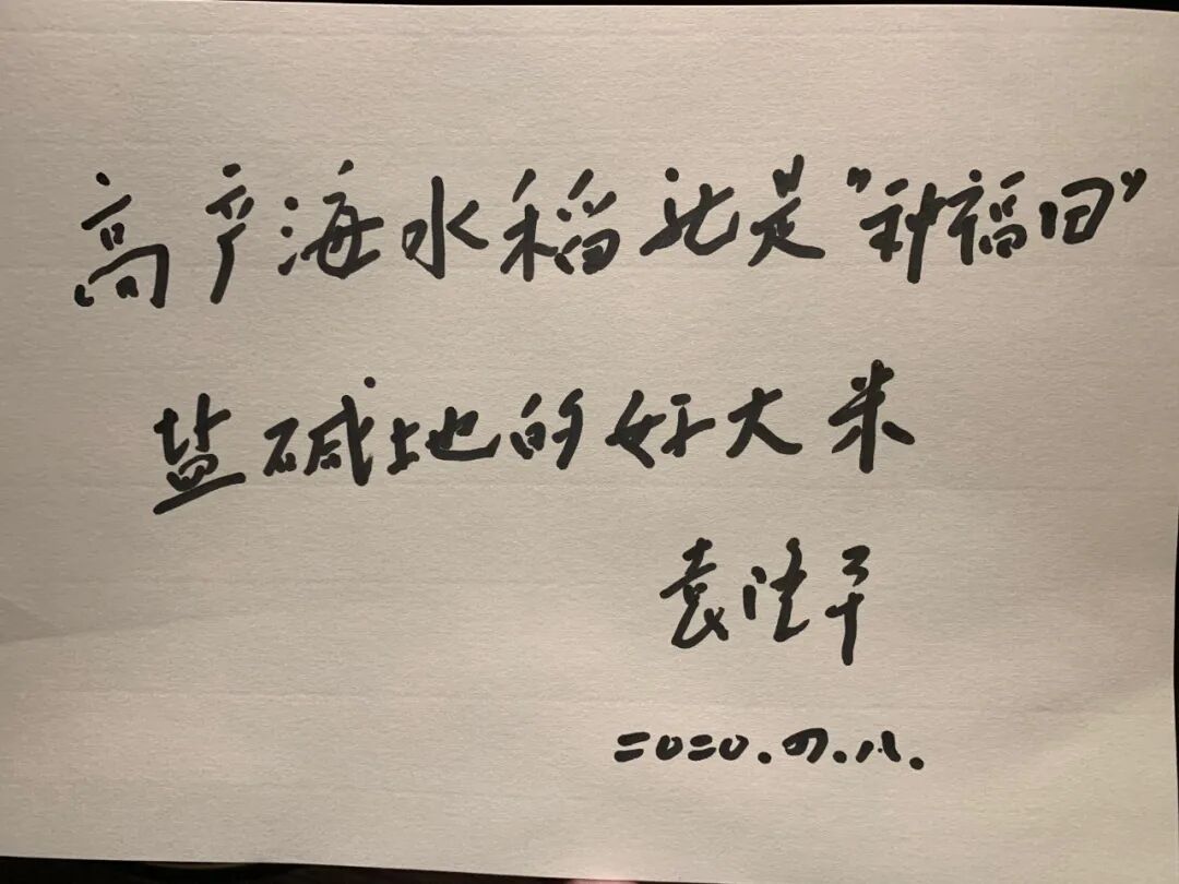 40分钟,谈当下话未来,大家收获很多。当得知禹王湿地海水稻接连高产,并规划“海水稻一二三产业融合发展示范区”时,袁老高兴地竖起大拇指,称赞潍坊在海水稻产业中走在了全国前列,并欣然题词“乡村振兴 滨城先行”、“责任担当 情系民生”。当场,他还为海水稻大米起了一个意义深远的名字“种福田”,题词“高产海水稻就是‘种福田’,盐碱地的好大米。”