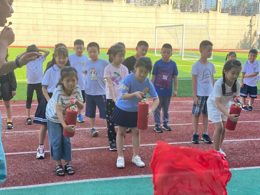 你知道有多少种灭火器吗?你知道如何正确灭火吗?在了解了灭火知识后,同学们拿起灭火器,学习实际运用电子灭火器灭火。同学们沉稳镇静,对准“火源”根部,定准目标,千钧一发,将火熄灭。这样的应急技能将为他们的一生保驾护航。