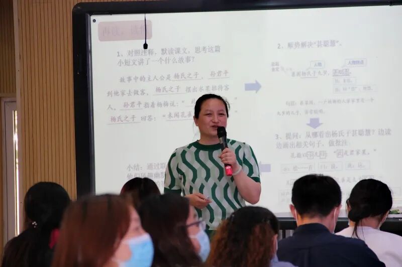 吕梅副校长开场主持之后,这群特殊的“学生”开始课堂学习。一小时的课堂分为语文、数学、英语三个时段,青岛枣山小学孙琳老师、林晓老师、曲跃跃老师带领这群特殊的“学生”分别了解了语文、数学、英语教材内容。孙琳老师以《杨氏之子》为例、林晓老师以《长方体和正方体的认识》为例、曲跃跃老师以《Module 6 Unit 1 We’ll see lots of very big stones.》为例,请家长做学生,展示了课例教学过程。课堂上,“学生们”有的积极发言,有的比较拘谨,有的妙语连珠引得满场掌声,有的英语朗读引得大家啧啧称赞。