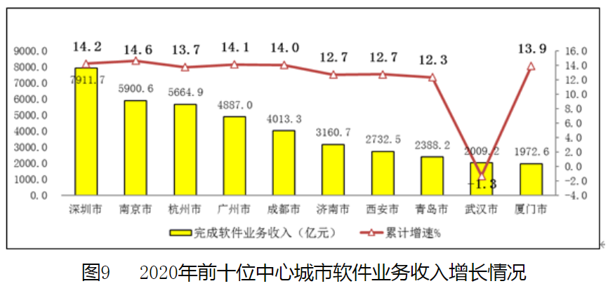 2020年,软件业务收入达到2388.2亿元,连续两年位居15个副省级中心城市第8位,稳居全国第一阵营。