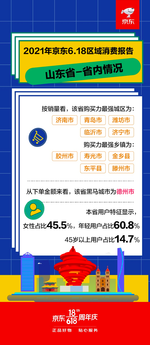 青岛日报社/观海新闻6月18日讯 今年,是京东“618”购物节的第18个年头。当天,京东发布了“618”消费报告,报告显示,截至6月18日,山东省购买力排名刷新历史战绩,位居全国第四位,当日成交额同比增长39%,表现迅猛。青岛成为山东省购买力最强的城市,胶州市则位列全省县域消费榜单首位。