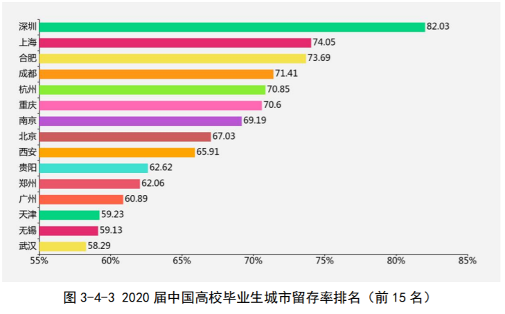 根据梧桐果统计的全国数据,2020届中国高校毕业生城市留存率排名第一的是深圳,第二是上海。这两座城市都是综合实力超群的一线城市,留存率与实力完全匹配。而高校毕业生的留下,又将为城市发展继续创造价值和需求。