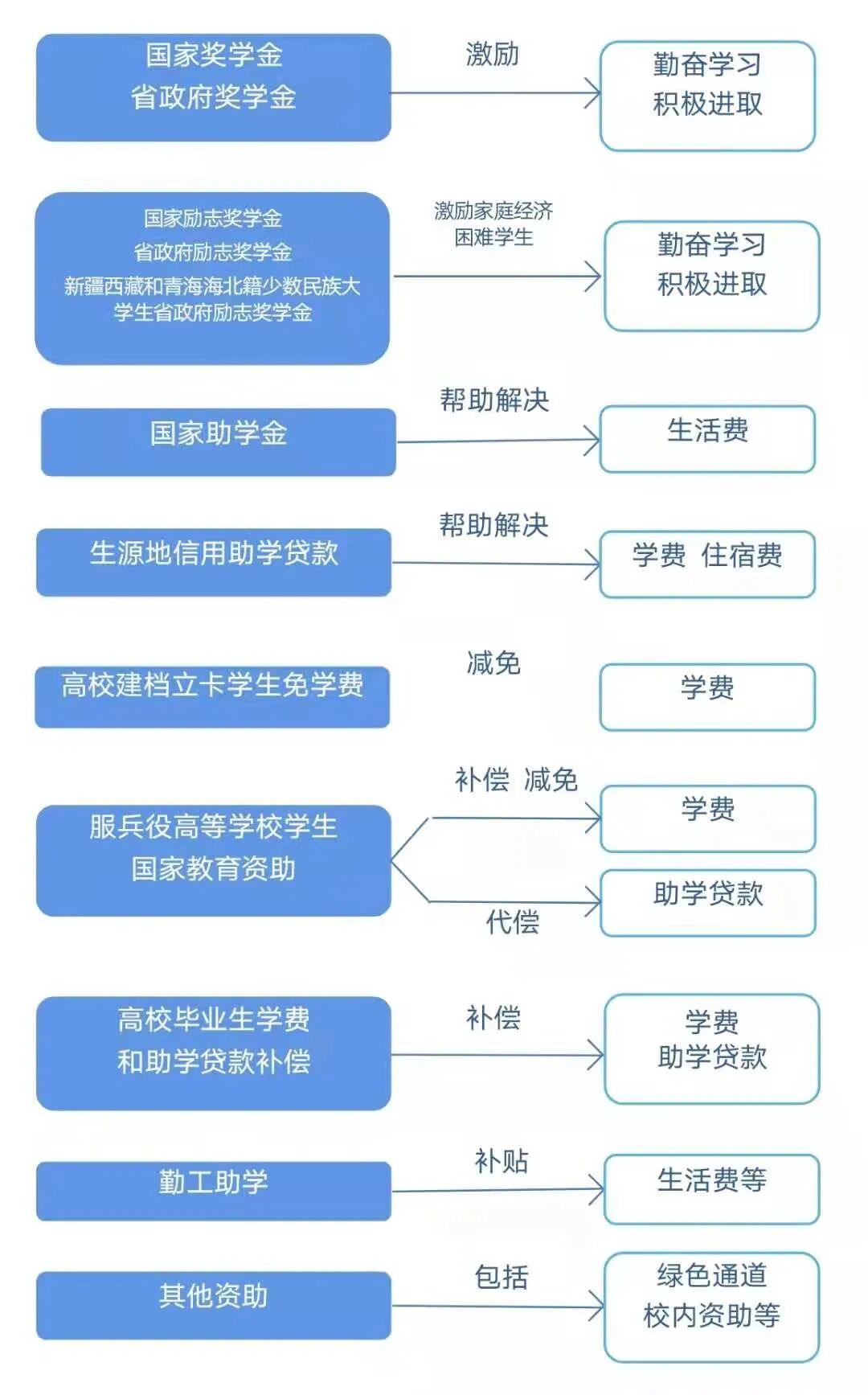 山东省在高等教育本专科阶段建立起国家和省政府奖学金、国家和省政府励志奖学金、国家助学金、生源地信用助学贷款等多种形式有机结合的高校学生资助政策体系(如遇国家和省政策调整,以新政策文件为准执行)。