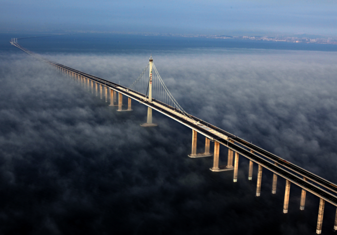 从空中俯瞰,一桥雄峙胶州湾,如蛟龙潜海、长虹卧波。宽阔桥面上,鱼贯的车流往来穿梭,一幅城市的活力画卷铺展开来。