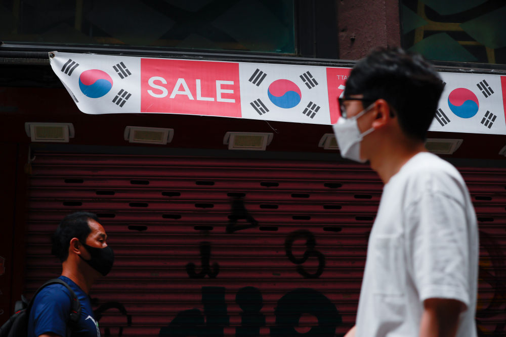 9月5日,戴口罩的人们经过韩国首尔明洞一处打折的横幅。新华社记者王婧嫱摄