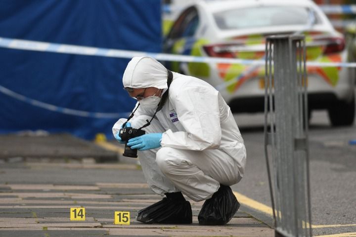 9月6日,一名警察在英国伯明翰持刀伤人事件现场拍照收集证据。新华社/法新