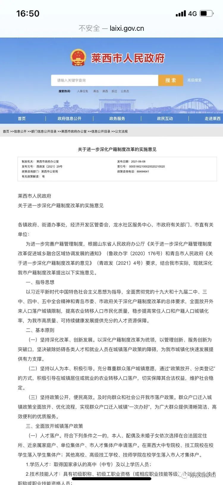 6月8日,莱西发布《莱西市人民政府关于进一步深化户籍制度改革的实施意见》;