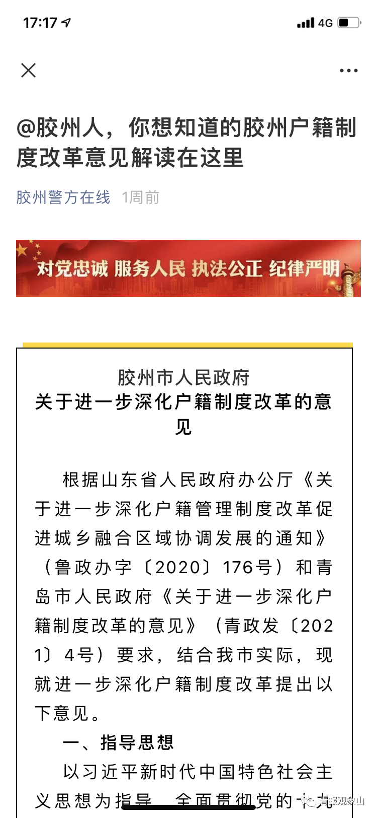 6月24日,胶州发布《胶州市人民政府关于进一步深化户籍制度改革的意见》。