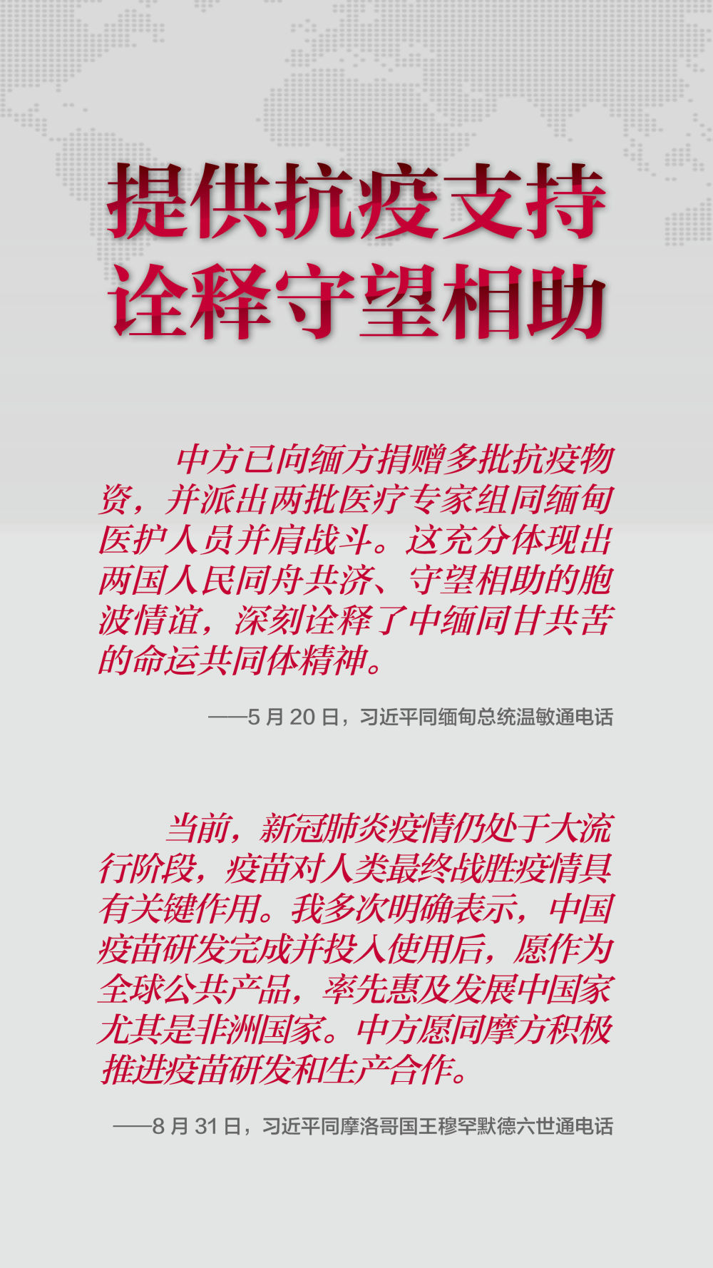 既有双边对话,也有多边会议;既有与来自亚、欧、非、北美、南美等大洲国家领导人互动,也有同国际组织负责人会见通话;既面向外国政要和国际组织,也面向外方友好人士和普通民众;既谈疫情防控,也谈传统友谊、务实合作、复工复产、“一带一路”、多边主义、全球治理等话题。