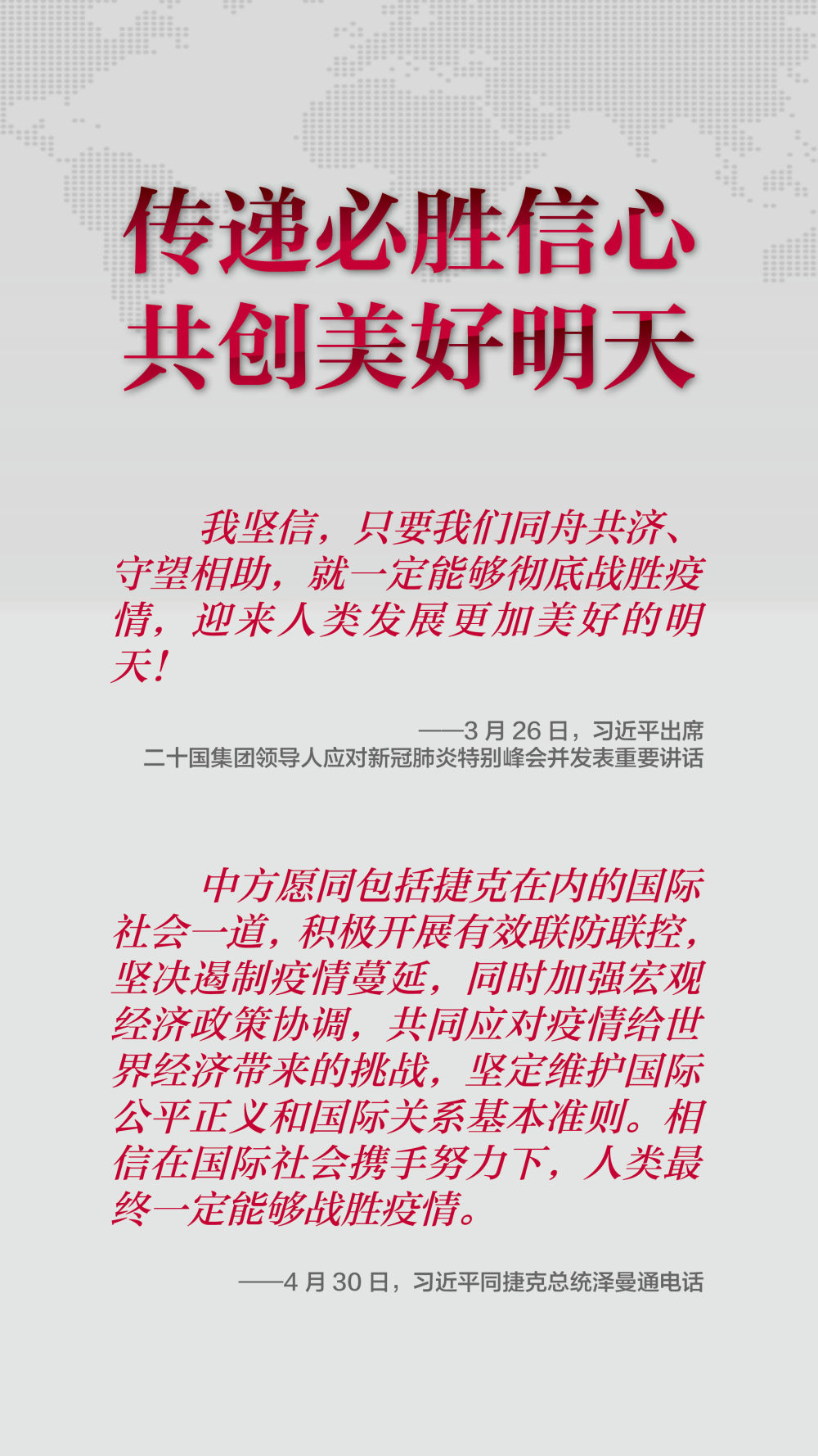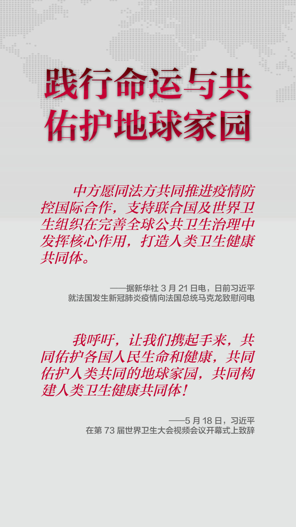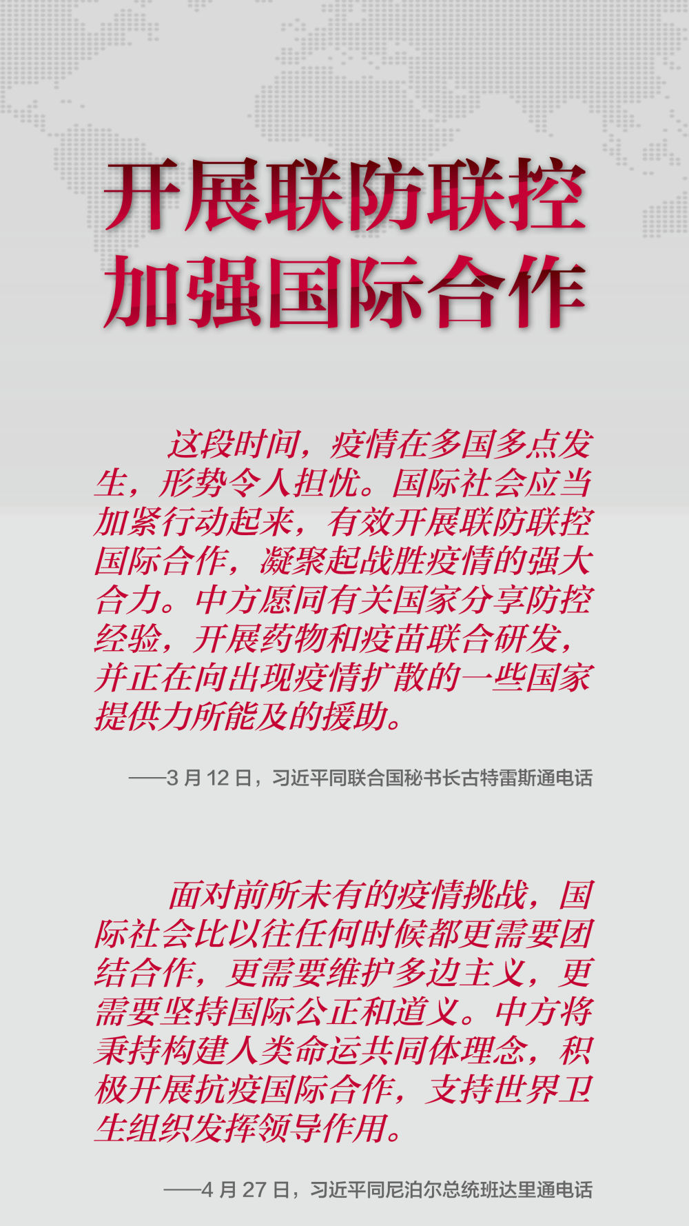 新冠肺炎疫情发生以来,习近平主席时刻关注国内外疫情形势,高度重视抗疫国际合作,频频开展元首外交,从构建人类命运共同体高度,推动疫情防控国际合作,发出国际社会携手抗疫、共克时艰的最强音。