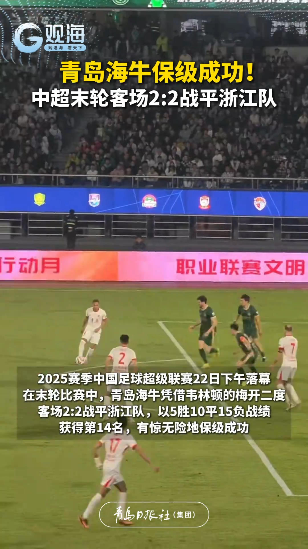青岛海牛保级成功!中超末轮客场2:2战平浙江队