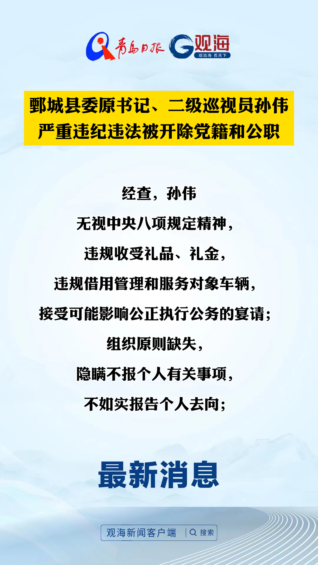 鄄城县委原书记、二级巡视员孙伟严重违纪违法被开除党籍和公职