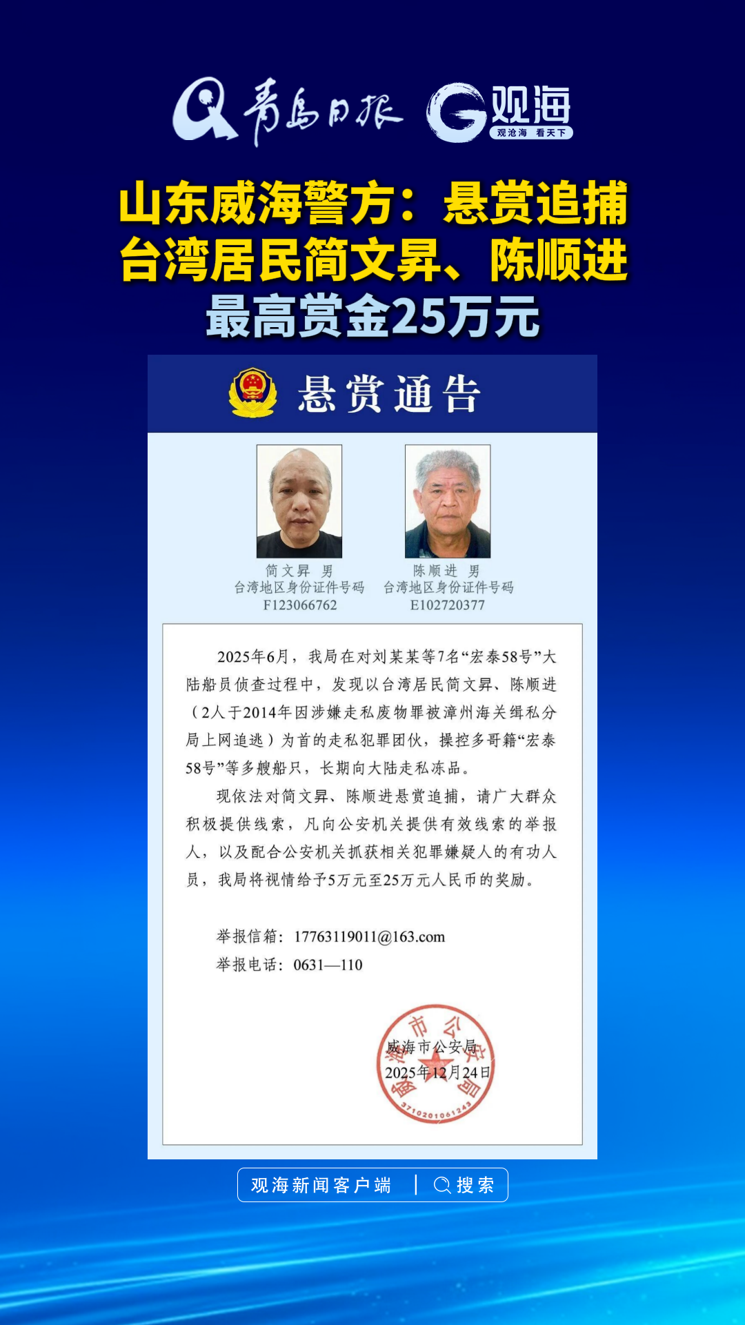 山东威海警方:悬赏追捕台湾居民简文昇、陈顺进,最高赏金25万元