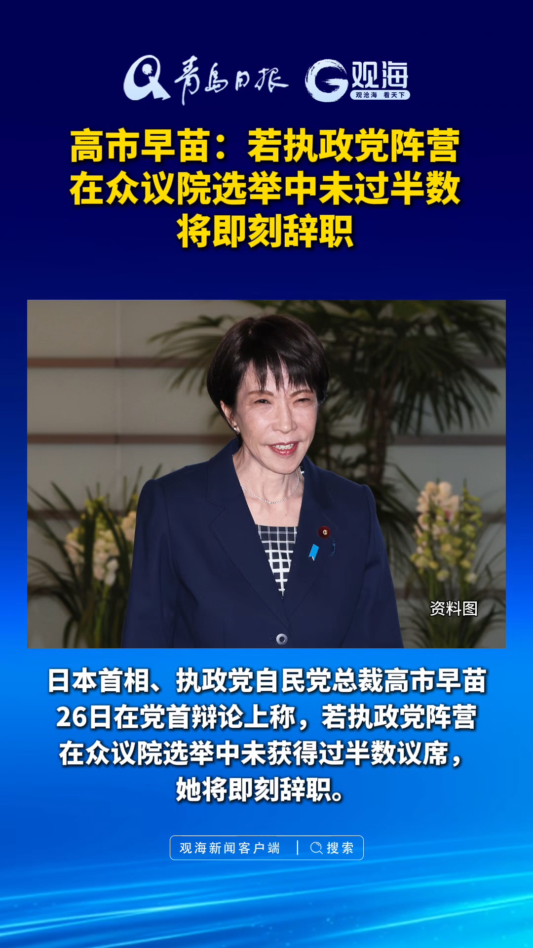 高市早苗:若执政党阵营在众议院选举中未过半数 将即刻辞职