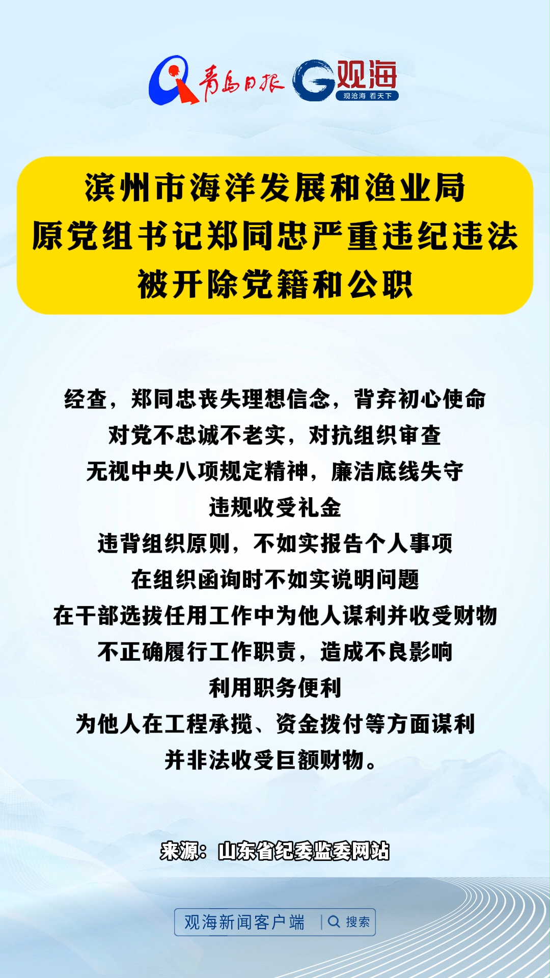 滨州市海洋发展和渔业局原党组书记郑同忠严重违纪违法被开除党籍和公职