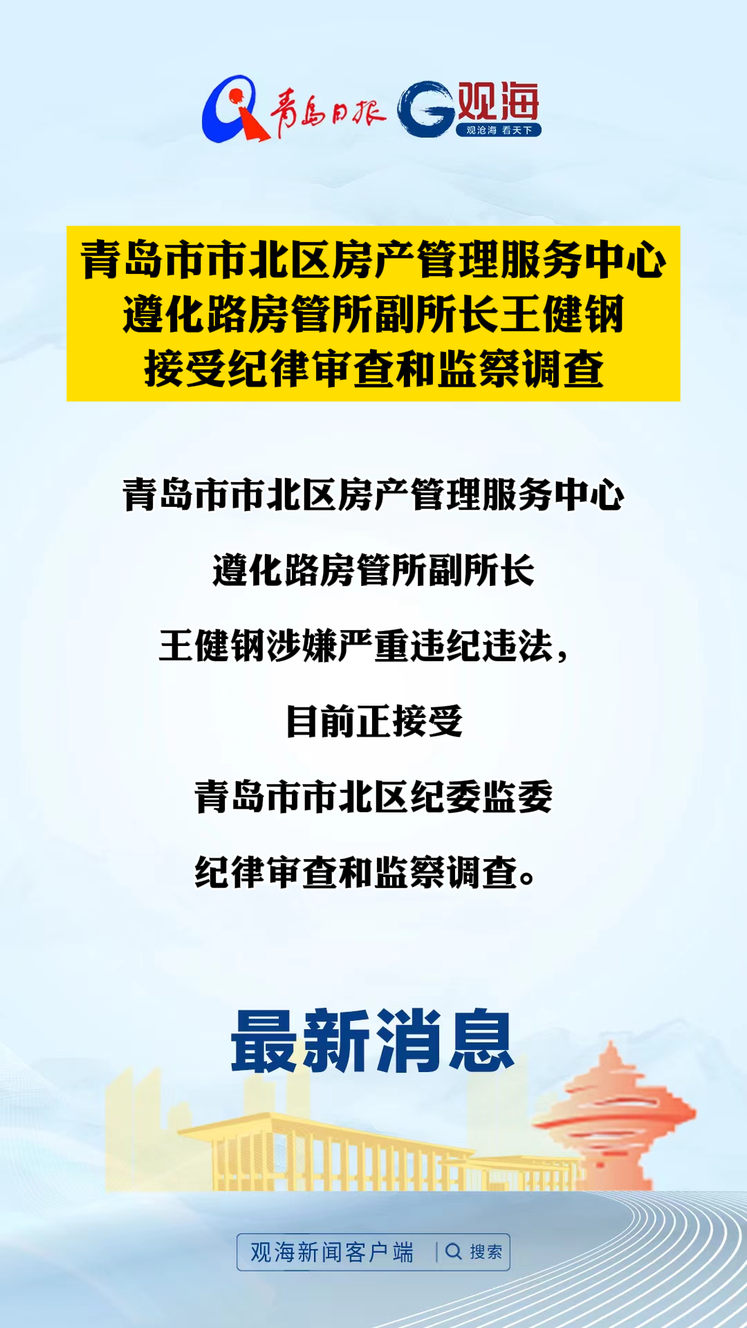 青岛市市北区房产管理服务中心遵化路房管所副所长王健钢接受纪律审查和监察调查
