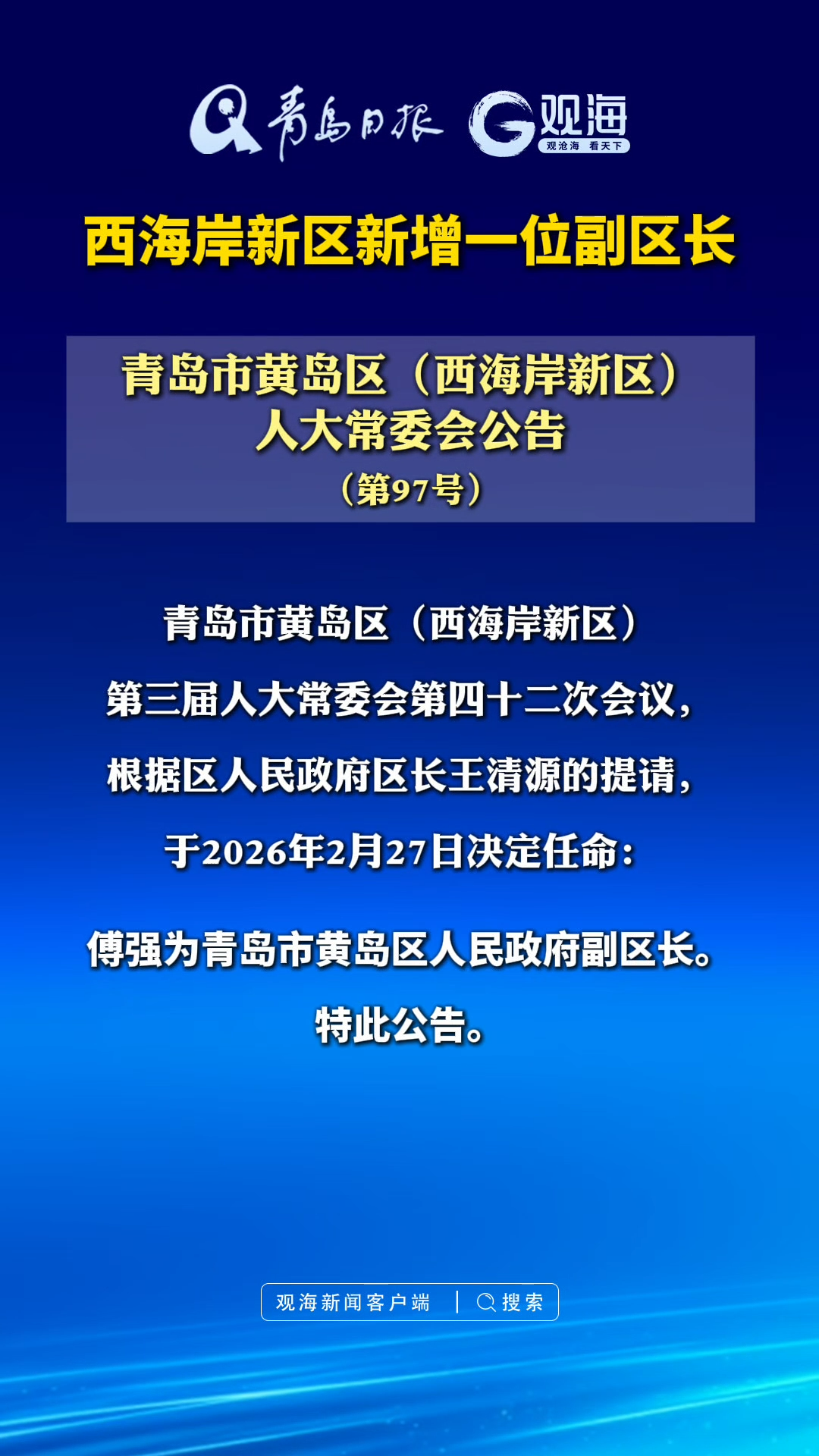 西海岸新区新增一位副区长