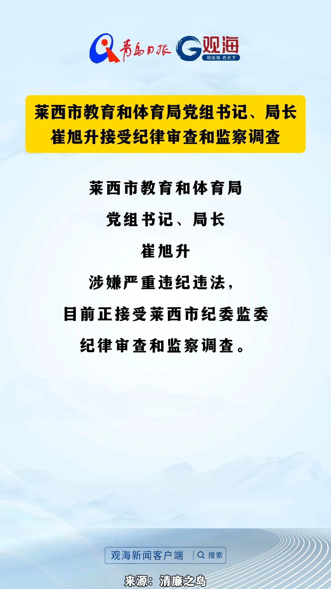 莱西市教育和体育局党组书记、局长崔旭升接受纪律审查和监察调查