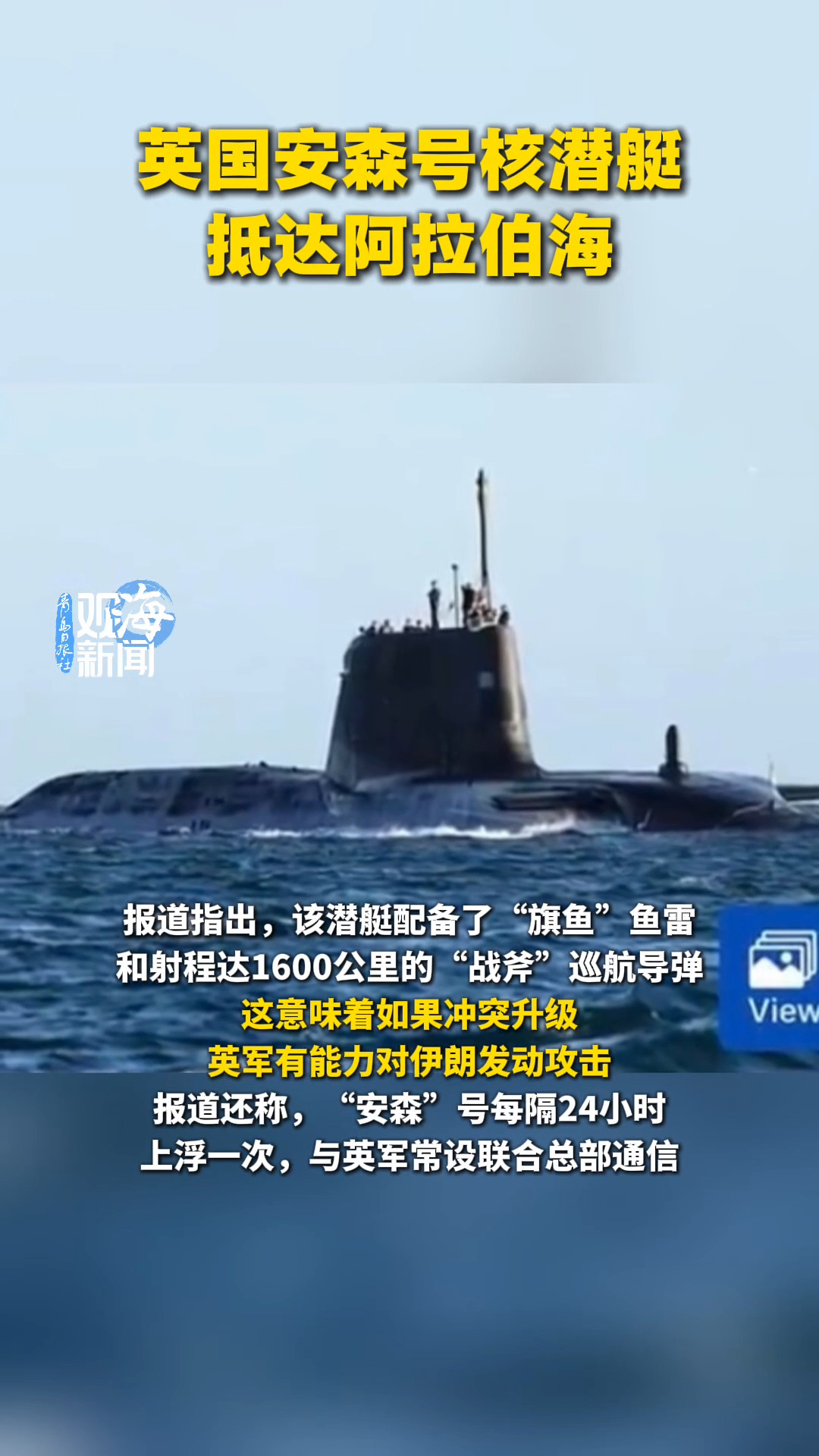 英国安森号核潜艇抵达阿拉伯海