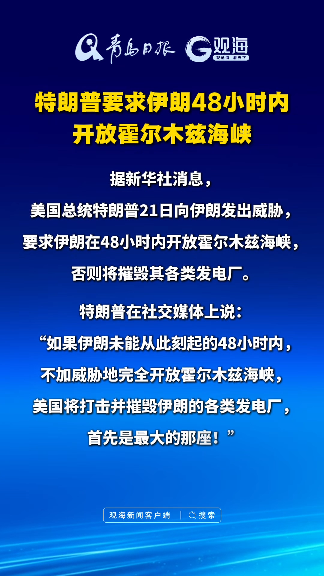 特朗普要求伊朗48小时内开放霍尔木兹海峡