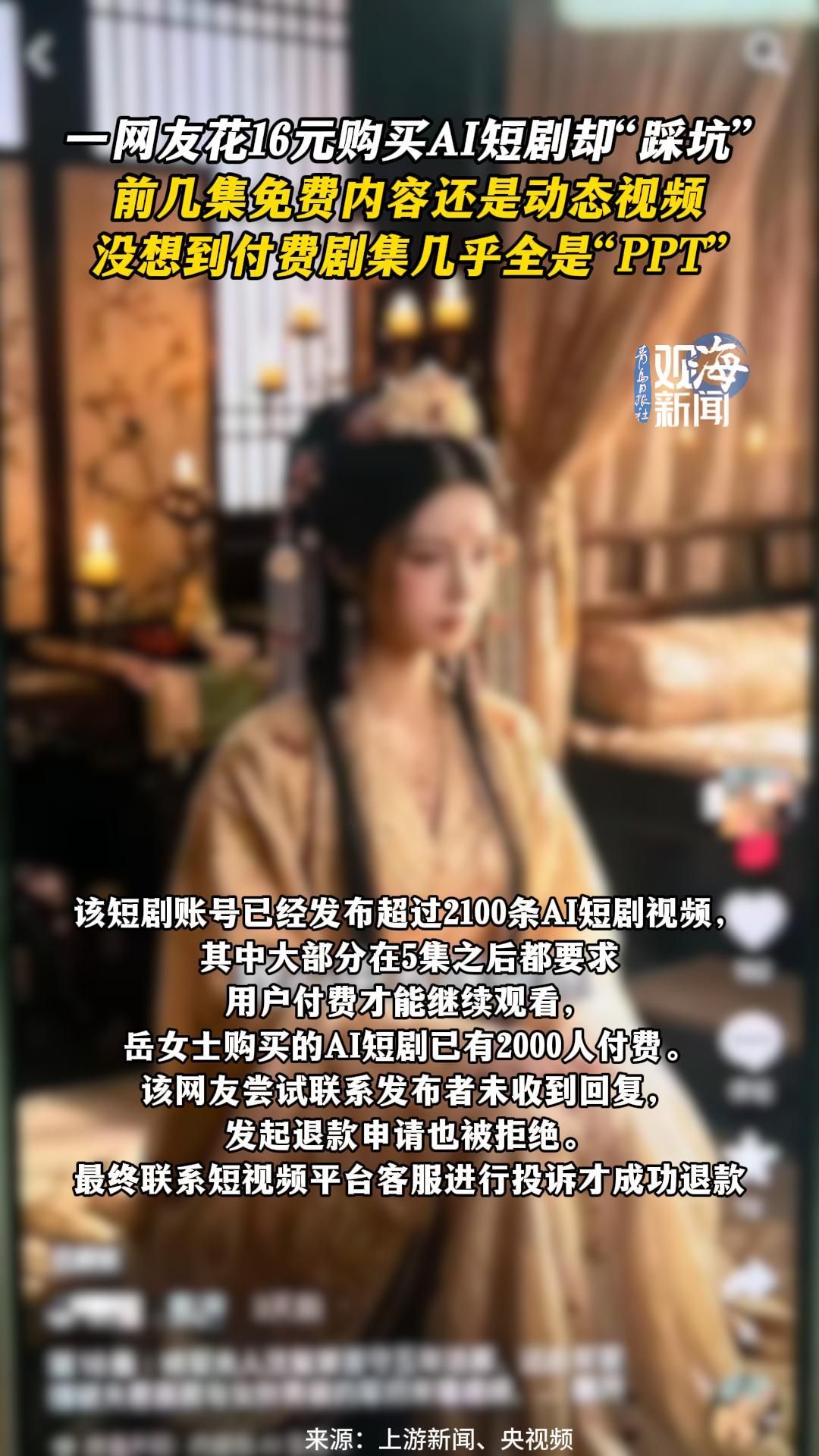一网友花16元购买AI短剧却“踩坑”,前几集免费内容还是动态视频,没想到付费剧集几乎全是“PPT”