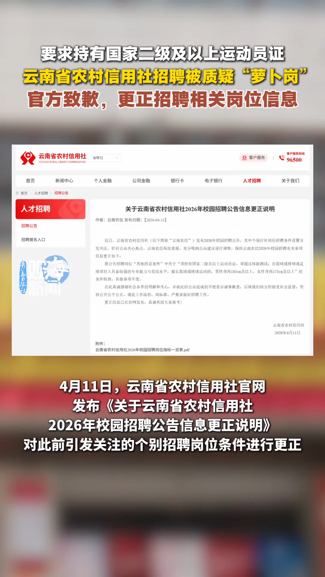 云南省农村信用社招聘被质疑“萝卜岗”,官方致歉