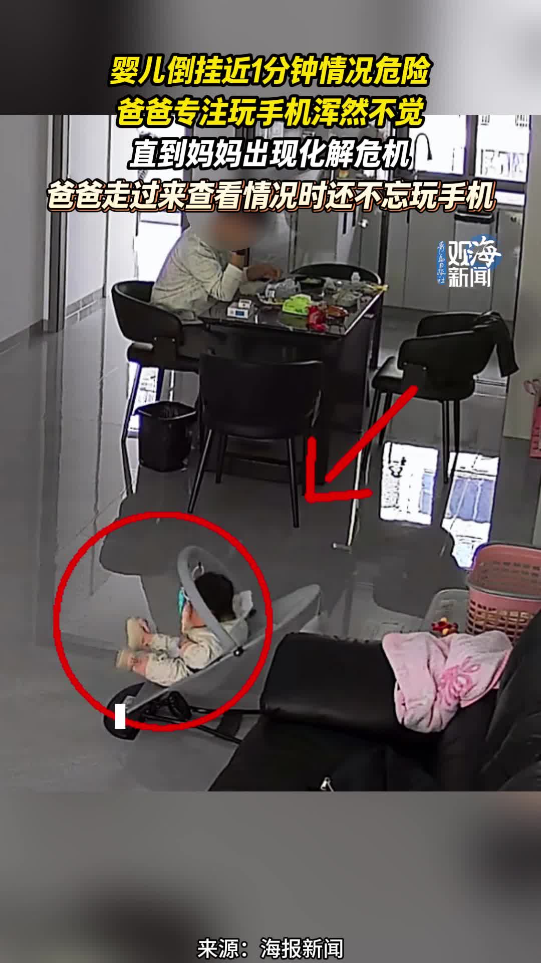 婴儿倒挂近1分钟情况危险,爸爸专注玩手机浑然不觉