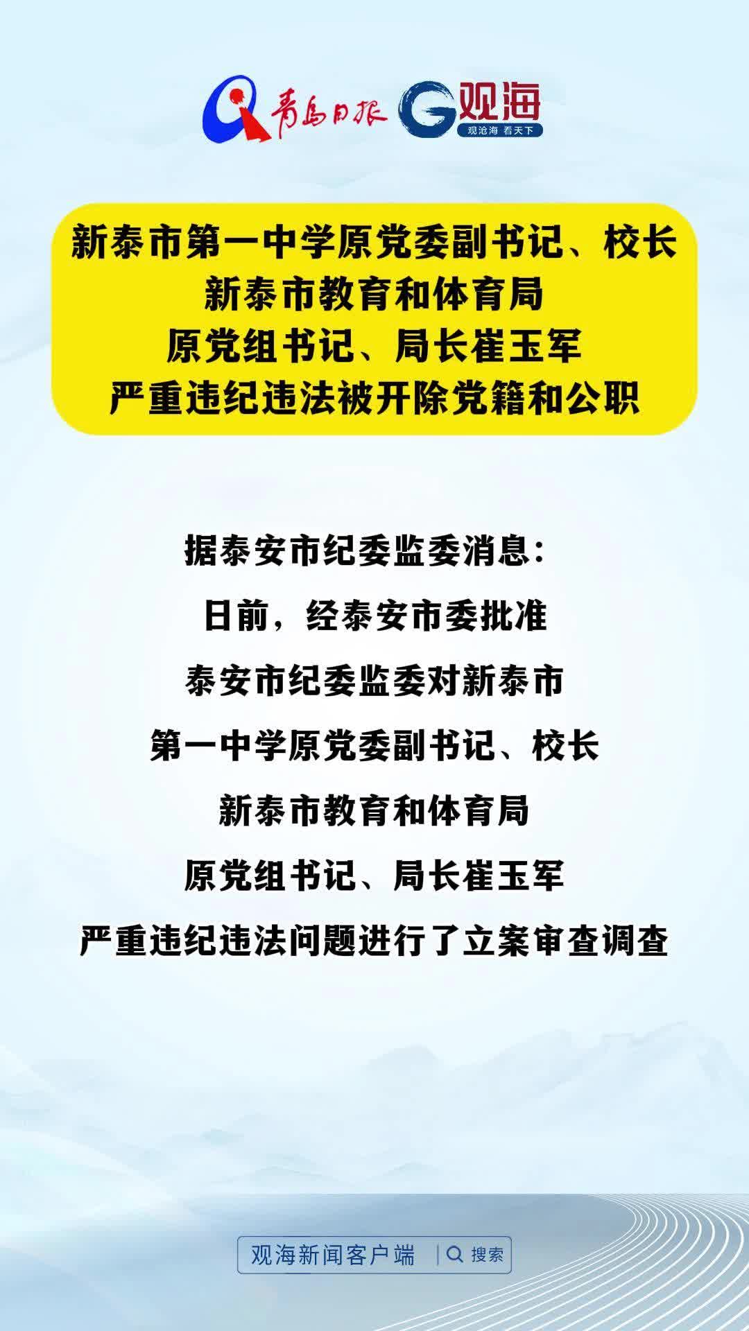 新泰市第一中学原党委副书记、校长,新泰市教育和体育局原党组书记、局长崔玉军严重违纪违法被开除党籍和公职